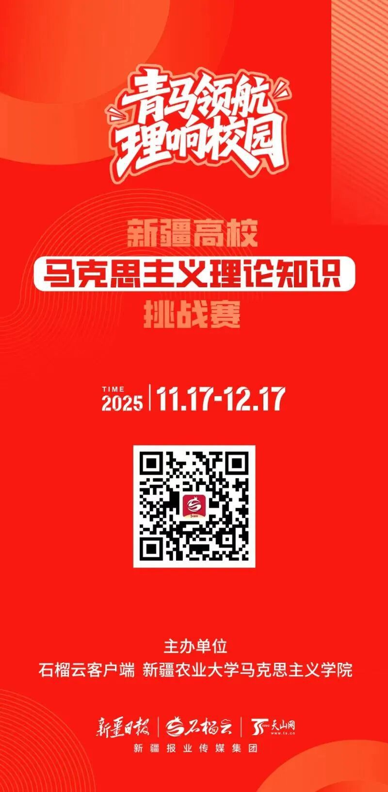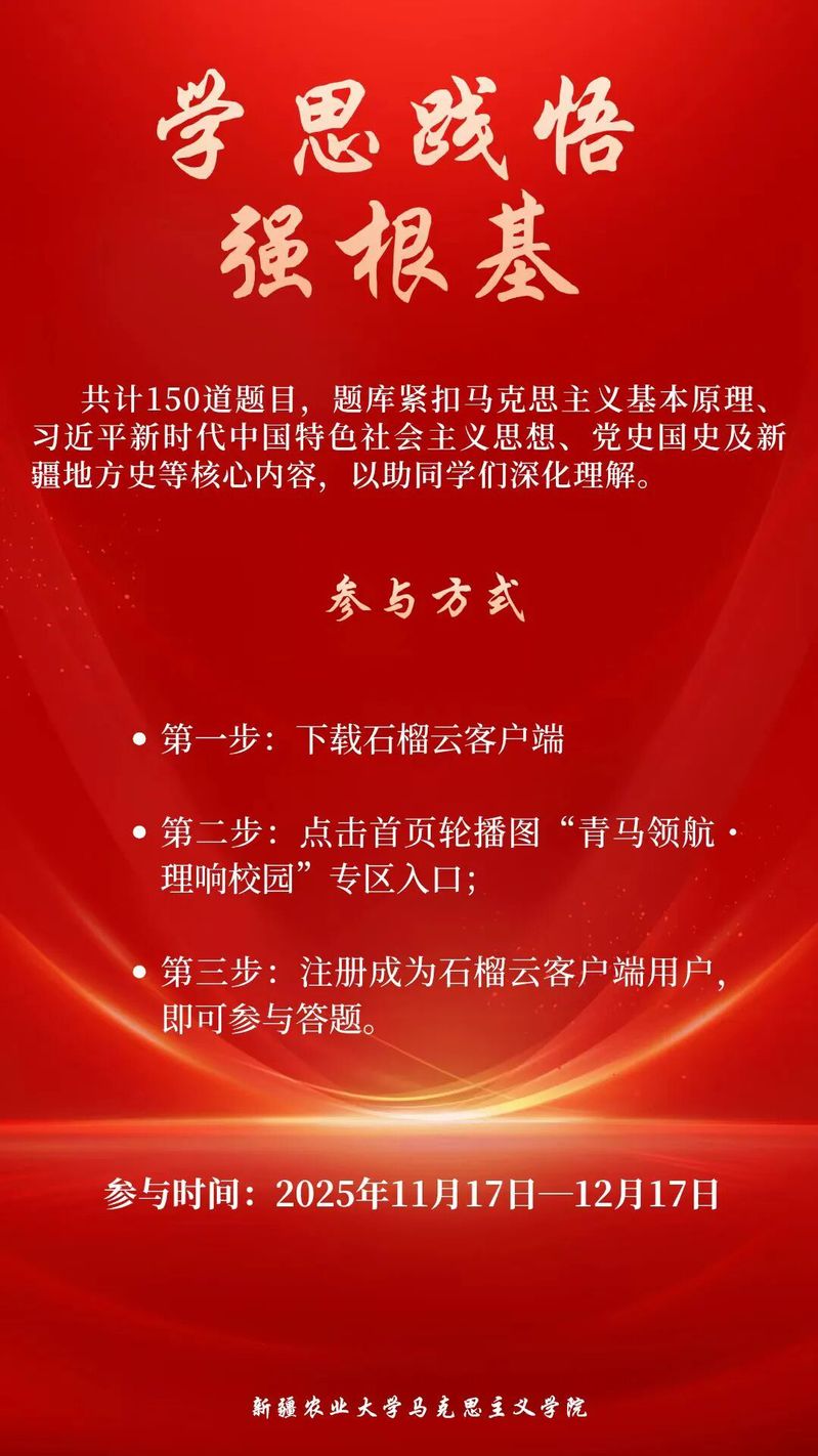 为加强习近平新时代中国特色社会主义思想学习,落实立德树人根本任务,推动马克思主义理论以贴近青年的方式走进校园,新疆农业大学马克思主义学院联合石榴云客户端,于11月17日正式启动“青马领航・理响校园”新疆高校马克思主义理论知识挑战赛,助力党的创新理论在青年学子心中扎根。