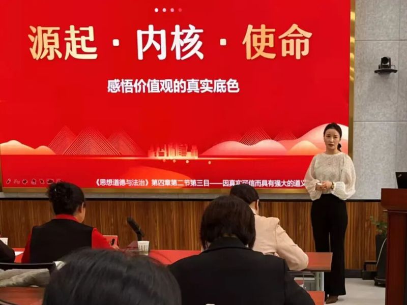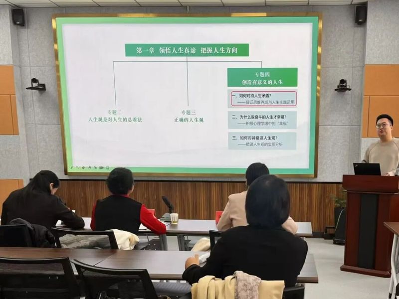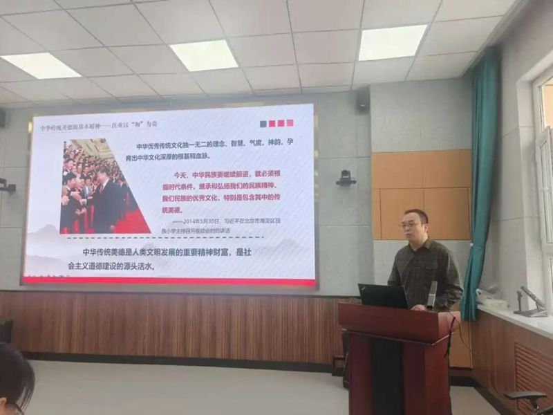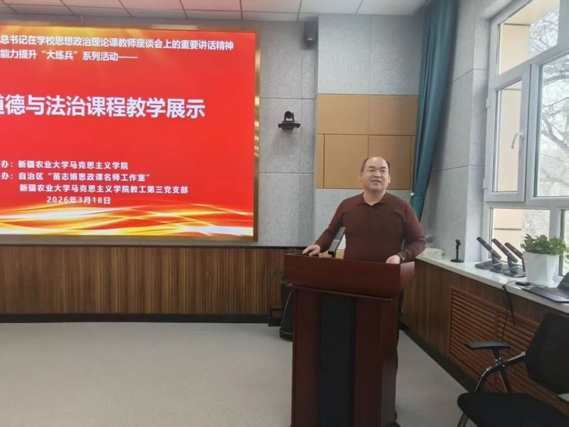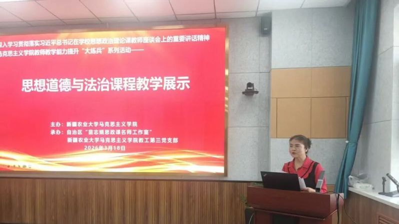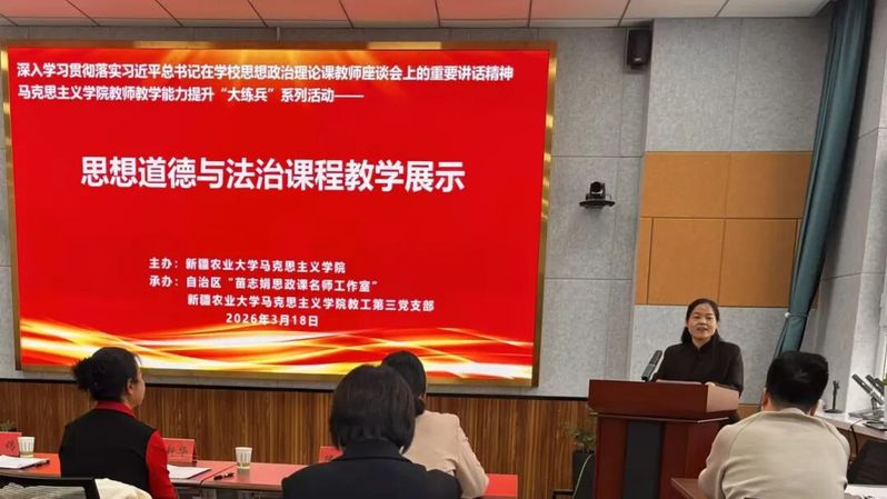 展示活动中,“德法”教研室的七位教师依次登台,围绕课程重点难点,结合时事热点与学生实际进行教学展示。徐致强老师以习近平总书记的重要讲话精神为引入,从“和”观念的缘起讲起,结合六尺巷的经典案例,深入剖析了传统“和”文化的历史脉络与当代价值;李进老师则以一截枯木枝作为实物导入,创设了生动的教学情境,通过“从枯木的沉寂到新生的力量”这一具象比喻,由浅入深地讲解了马克思主义的人民立场;张莹老师以网络流行语“斩杀线”切入课程,引导学生思考在多元思潮交锋的背景下,如何坚定社会主义核心价值观自信;王嘉辰老师采用问题链式教学法,层层递进,引导学生正视人生中的不如意,他的讲授逻辑严密,注重学理支撑,展现了扎实的学术功底;伊再提古丽·可依木老师结合农业大学办学特色,将艰苦奋斗精神与学农爱农、强农兴农的时代使命相结合,深刻阐述了为什么“艰苦奋斗是新时代青年的青春底色”。王宇老师以问题导入,从历史的高度、理论的深度、现实的宽度和情感的温度四个维度,系统解读了宪法如何为民族复兴伟业发挥“定海神针”的关键作用。淳静老师则聚焦人的本质与自我认知,以“何以为人,何以为我”这一哲学追问为主题,引导学生在认识人的本质的基础上,探索个体价值与生命意义。