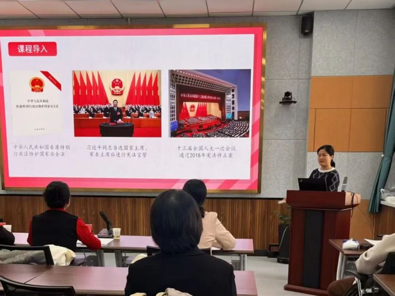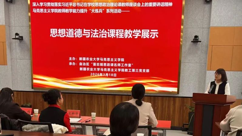 为深入学习贯彻习近平总书记在学校思想政治理论课教师座谈会上重要讲话精神,推动思政课改革创新,锻造高素质思政课教师队伍,3月18日,马克思主义学院举办教师教学能力提升“大练兵”系列活动——“思想道德与法治”课程展示活动。自治区教学名师、校级督导寇新华教授,自治区高校教师思想政治理论课说课大赛一等奖获得者、新疆大学马克思主义学院贺鸽副教授,自治区教学能手、计算机与信息工程学院陈燕红教授,自治区教学能手、马克思主义学院院长蒲丽霞教授担任评委。学院副院长苗志娟主持本次活动。