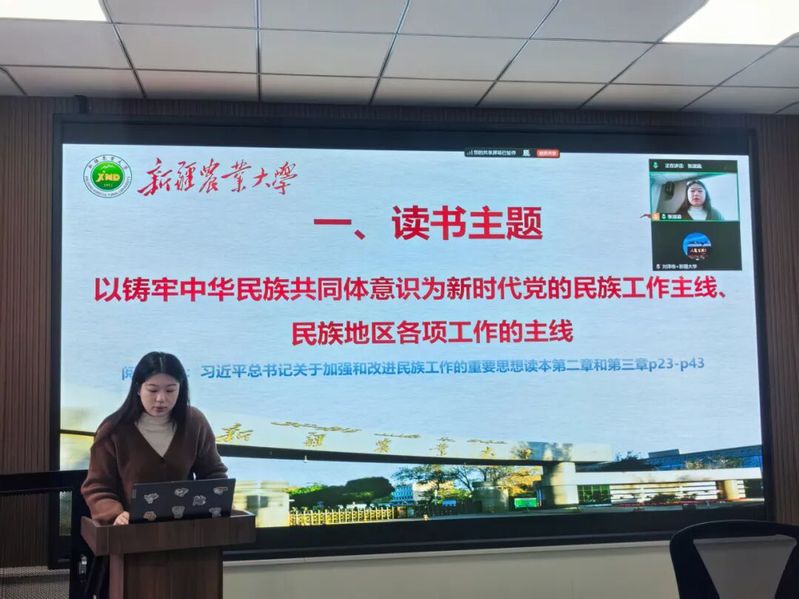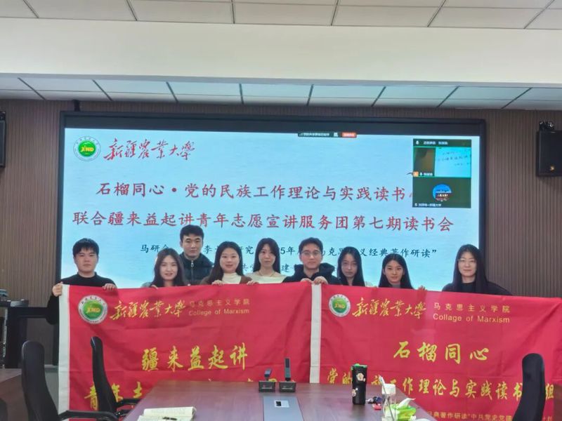 12月1日,“石榴同心·党的民族工作理论与实践”读书小组联合“疆来益起讲”青年志愿宣讲服务团开展第七期读书会。本期读书会围绕“以铸牢中华民族共同体意识为新时代党的民族工作主线、民族地区各项工作的主线”这一主题,结合领读、交流分享和主题讨论等形式,深入学习《习近平总书记关于加强和改进民族工作的重要思想学习读本》第二章和第三章内容。